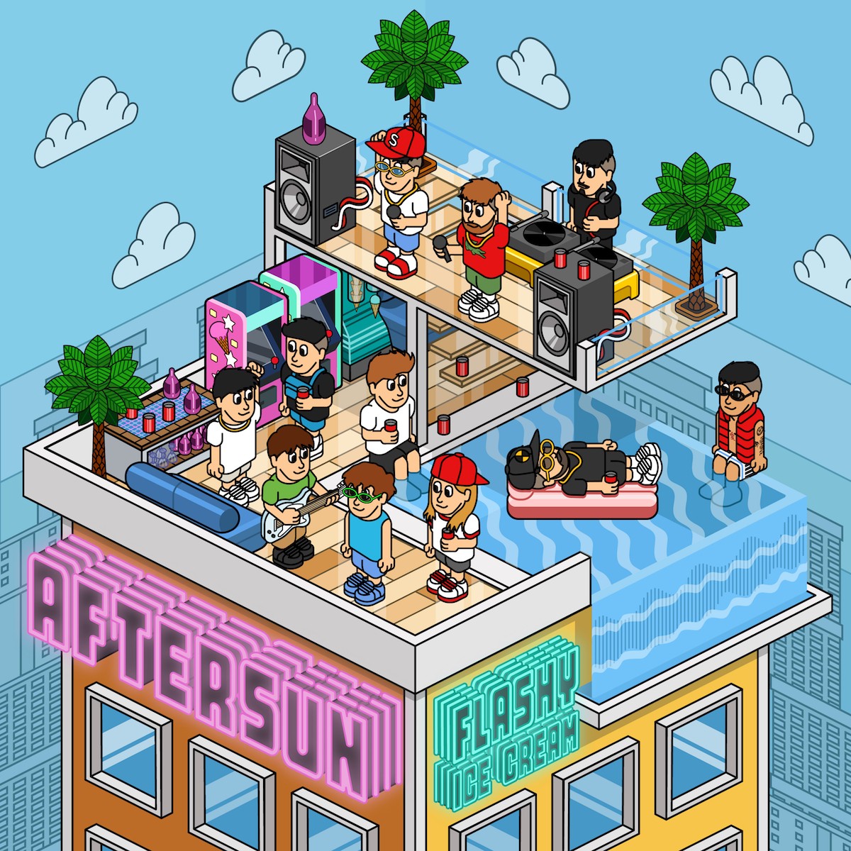 Canviant totalment de tema, una de les coses més curioses del disc és la portada, amb una il·lustració totalment inspirada en el joc en línia Habbo. Què en podeu dir? S.F: El dissenyador de la portada és en Teriyaki Donut. Ja ens havia dissenyat la portada de Don Gelato(Delirics, 2020) i per aquest EP volíem tornar a una portada amb il·lustració. En un primer moment, volíem una il·lustració 3D, però com vam veure que FigaFlawas n'havia fet una d'aquest estil, ja no ho vam tenir clar perquè no volíem fer una cosa molt igual a la seva. P.G: Llavors, en Teriyaki va plantejar una perspectiva zenital d'un rotllo Habbo i, de cop vam veure que fer una portada inspirada en Habbo podria funcionar. A més, com a curiositat, li vam passar tots els perfils d'Instagram de la gent que col·labora al disc perquè els incorporés a la portada!