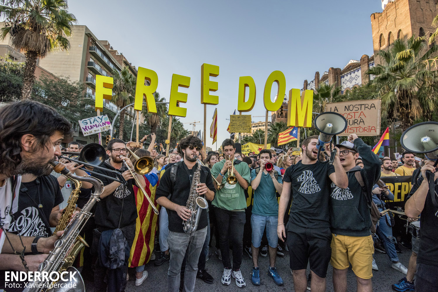 Músics contra la Repressió a la manifestació del 26 d'octubre al carrer Marina de Barcelona