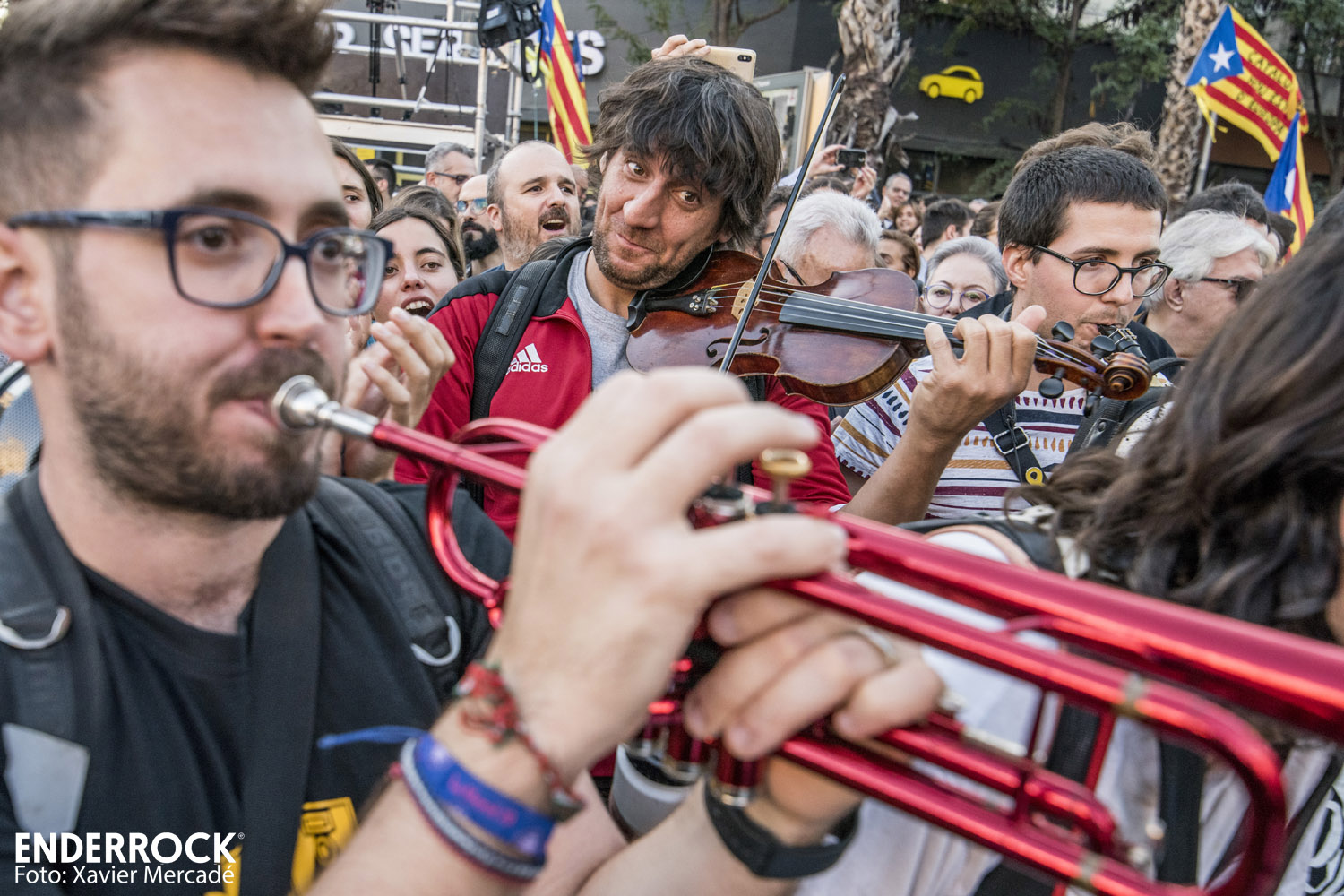 Músics contra la Repressió a la manifestació del 26 d'octubre al carrer Marina de Barcelona