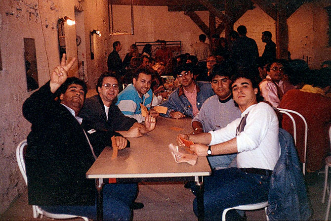 Sopar abans d’un concert · Tardor de 1992 · Tours (França) · Ricardo Batista 'Tarragona', Manolo González 'Patata', Rafalito Salazar, Pep Lladó, Antoni 'Sicus' Carbonell i Pep Cucurella · foto: arxiu Ai Ai Ai