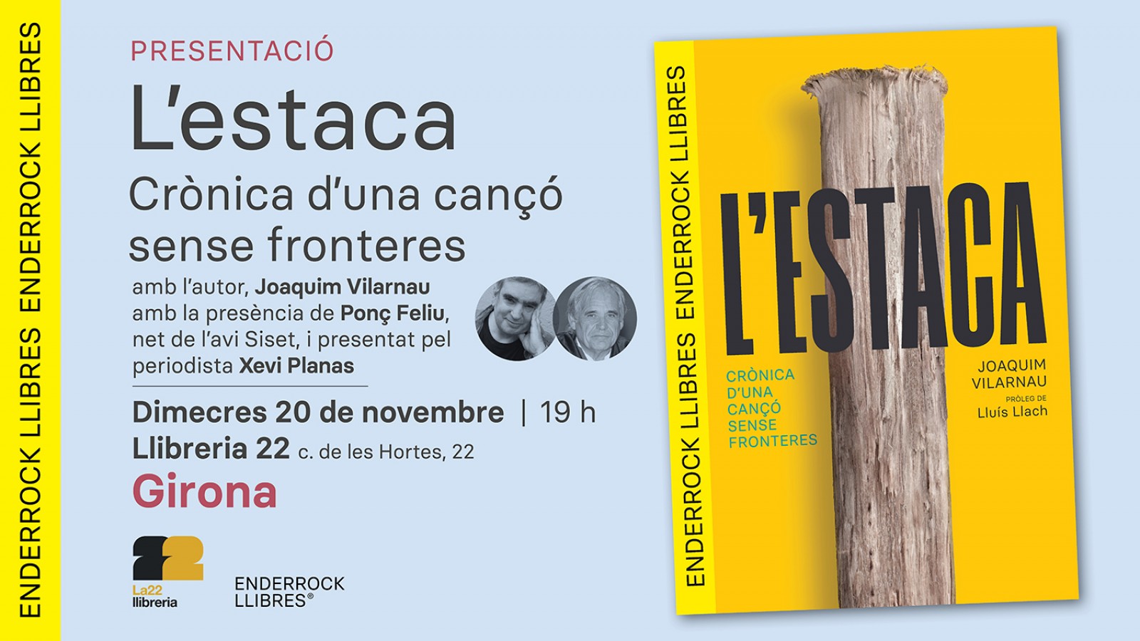 L'estaca. Crònica d'una cançó sense fronteres (Enderrock Llibres, 2024) es presentarà aquesta setmana a Tarragona, Girona i Lleida. En concret, ho farà el proper dimarts 19 de novembre a les 19 h a la Llibreria El Soterrani de Tarragona, l'endemà dimecres 20 de novembre a les 19 h a la Llibreria 22 de Girona, i el dissabte 23 de novembre aterrarà a La Fatal de Lleida, a les 18h.