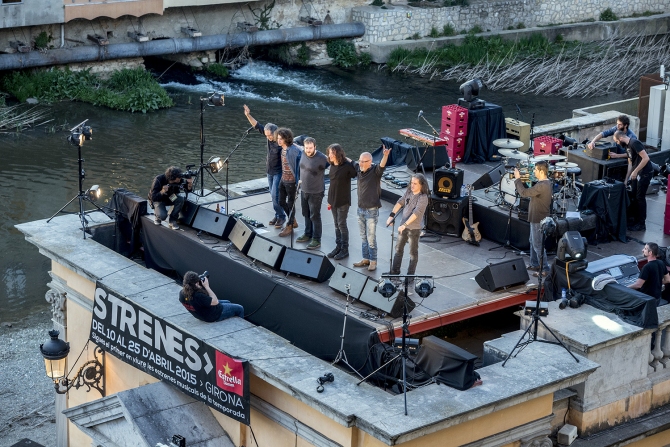 Sopa de Cabra Foto: Xavier MercadéEl concert sorpresa del festival Strenes ha convocat molta gent al Pont de Pedra de Girona. Des d'allà el públic ha pogut gaudir durant tres quarts d'hora del directe de Sopa de Cabra . El grup ha actuat al terrat de l'Oficina de Turisme a l'estil que van fer The Beatles a Londres i U2 a Los Angeles. En record d'aquesta acció històrica i inspirant-se en aquestes dues actuacions, en resultarà un videoclip de "Camins", gravat en directe.