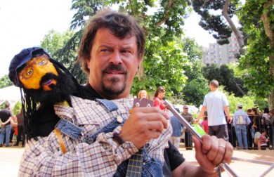 Foto: Tot un especialista en música i reciclatge, Félix de Blas, amb el seu titella de Xesco Boix.