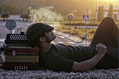 Joan Garriga i el seu acordió en una cruïlla. Pensant? Descansant? Dormint?