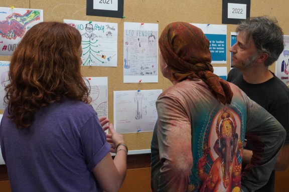 Amb totes les autoritats presents, Steven Van Zandt ha arribat a l’escola Thau amb un outfit al més pur estil estrella del rock: camisa de colors amb una imatge de Buda i botes amb estampat de guepard. Diferents professors han acompanyat al cantant presentant la recerca que estan fent els alumnes d’artistes com Rosalia, Beyoncé, Bad Bunny, Selena Quintanilla o Gorillaz. Aprofitant la visita del guitarrista, alguns dels alumnes li han pogut ensenyar els seus treballs, i també han exposat diferents retrats en blanc i negre i a color que han fet d’ell.