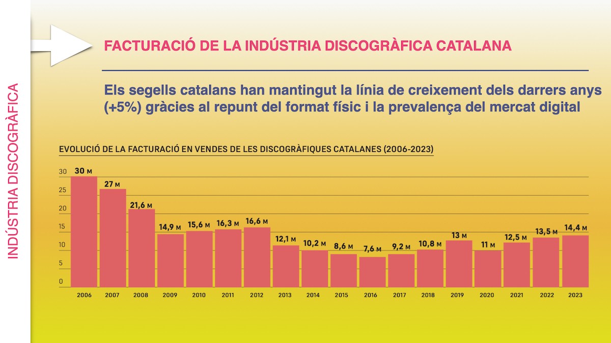 Els 14,4 milions d’euros facturats per segells catalans el 2023 han suposat la millor dada des de l’any 2012, avalada pel creixement del negoci digital del 5% i, sobretot, per les vendes del format físic en un 14%. No obstant, les xifres de l’oficina del Dipòsit Legal han evidenciat que s’han editat un 5% menys de títols, amb un descens del 18% de publicacions en format CD, però amb un increment d’un 63% més en vinil i casset. Tot i això, el mercat físic representa a Catalunya només un 15,8% del total, però el 2023 ha augmentat el seu pes específic en un 1,1%.