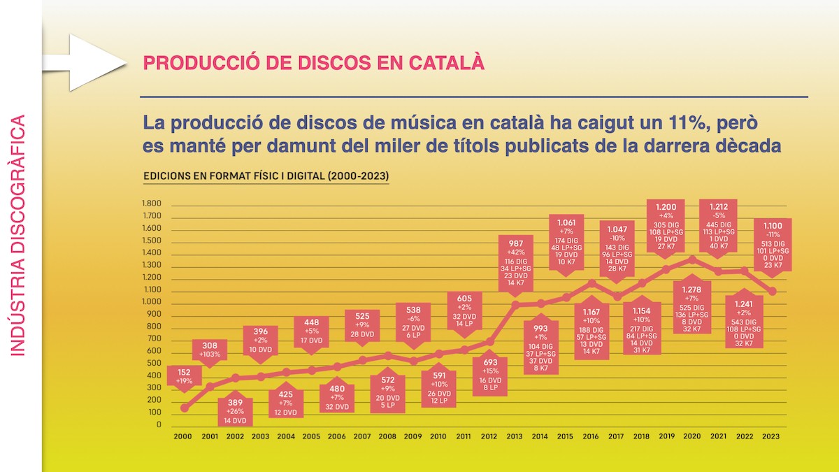 Tot i el bon moment de l’escena, la producció de discos en llengua catalana i instrumentals ha patit un decrement de l’11% fins a un total de 1.100 edicions, la dada més baixa des del 2017. Aquesta estadística recull tant edicions físiques com digitals, i inclou també les autoedicions. Ha caigut un 15% l’edició de discos en CD, un 6% la de vinils, un 28% la de cassets, i un 6% la d’àlbums i EPs en format digital.Per contra, si hi sumem la producció digital de senzills inèdits –cada cop més habituals en pop i música urbana (+11%)–, la producció total en català ha assolit les 2.211 referències, una xifra que ha mantingut les dades més altes de la història des del 2021, en plena pandèmia, quan es va registrar el rècord de 2.277 referències.