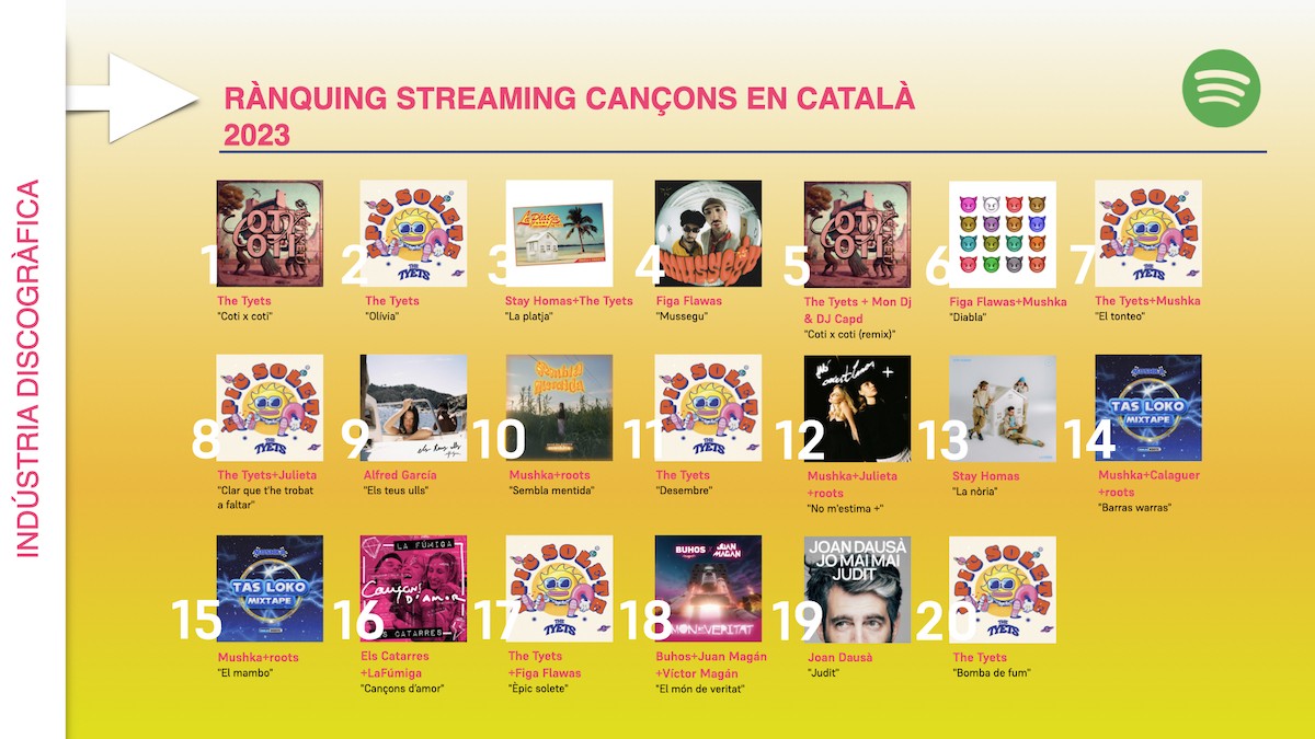 En el rànquing de les 20 cançons en català publicades el 2023 i més escoltades a través de la plataforma Spotify, el 45% ha portat el segell de The Tyets, i en el 75% dels casos hi apareix algun dels quatre artistes citats. La resta de temes més escoltats ha correspost a Stay Homas, Alfred García, Els Catarres, Buhos i Joan Dausà.