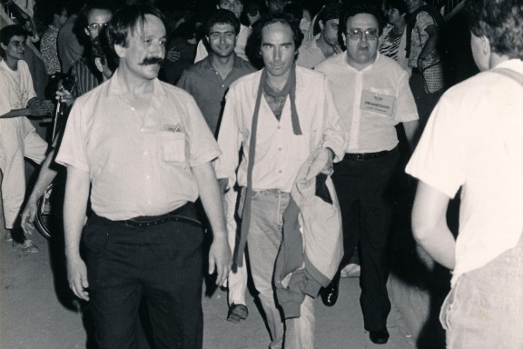 Joan Molas, Lluís Llach, Joan Carles Doval i Miquel Sellarès l'any 1985 durant el concert del Camp del Barça Foto: Arxiu Enderrock