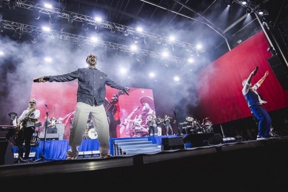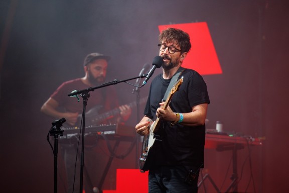A les 23:30h, el guitarrista, cantant i compositor Quimi Portet tornava al Cruïlla, per segona vegada, i donava el tret de sortida a l’escenari Vallformosa, batejat per ell com a l’escenari més sexy de tot el recinte del Fòrum (i potser per aquest tarannà humorístic va actuar en aquest espai reservat per la comèdia). El cert és que amb humor, ironia, un to sarcàstic i elegància va anar oferint molt bones cançons. Per començar va escollir “Macarrons”, seguit de “Montserrat” i “La Rambla”. Portet, sorprès d’actuar davant del públic més selecte del festival, va expressar que era difícil veure una concentració d’intel·lectuals tan nombrosa. Acompanyat pel seu incandescent conjunt musicovocal d'aquest World Tour 2025, Ángel Celada, Txell Rovira i Albert Lax, va delectar el públic amb una quinzena de cançons que recull en el llibre Cançons en bell llemosí (Segona Perifèria, 2025), tals com “La terra és plana”, “Massa”, “Francesc Pujols” o “Tinc una bèstia dintre meu”.