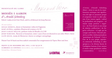 Avui dijous 13 de desembre a les 19.30 h, la llibreria La Central de Barcelona acollirà la presentació del llibre Moisès i Aaron d'Arnold Schönberg (Fragmenta, 2012), editat i traduït per Lluís Duch, doctor en antropologia i teologia, amb la col·laboració de Josep Barcons, llicenciat en humanitats i guitarra clàssica.