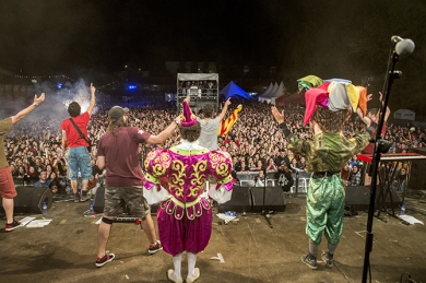 La nit de divendres al Clownia va tenir com a moment remarcable el recital d’Els Catarres, una banda que desperta passions entre el públic més jove. El trio d’Aiguafreda és a la recta final de la gira de presentació del seu segon disc, Postals (DiscMedi, 2013), amb el qual ha superat el complex de one hit wonder generat per “Jenifer” i s’ha revelat com una de les propostes populars de més èxit del panorama català. Un altre moment màgic va ser ja de matinada amb el recital de La Troba Kung-Fú. La presència de Joan Garriga i la seva banda era gairebé obligada: no en va la música que practiquen avui els Txarango –i molts altres grups de l’escena– és deutora d’aquella fusió entre els sons de la festa major de tota la vida i les músiques d'altres contrades que va començar a conrear Garriga durant els anys noranta al capdavant de Dusminguet. El reggae dels sards Train to Roots, el compendi de versions i temes propis de Buhos i la fusió festiva de Sra. Tomasa van completar el cartell de la primera nit.