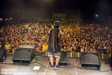Green Valley Foto: Xavier Mercadé Els assistents van seguir fidels a la cita i ahir cap a les 22 h van aplegar-se a l'espai independència per escoltar l'estrena de Green Valley a l'Acampada. Tot i les quatre gotes que van caure, el públic va gaudir del reggae del grup format per bascos i catalans. Abans de mitjanit Aspencat va donar pas al doblet valencià seguits dels companys de La Gossa Sorda . El cantant dels de la Marina Alta, Kiko Tur, valora molt positivament la tasca del festival i pel que fa a l'actualitat, creu que "des de València es veu amb molta expectació el que està passant a Catalunya". A més, afegeix: "Crec que la independència de Catalunya obrirà moltes portes al País Valencià, tan de bo nosaltres puguem algun dia, no sé si prop o lluny, està en el mateix camí".