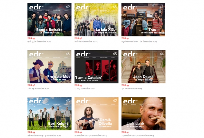 El setmanari EDR va néixer el 12 de desembre del 2013: un any i 50 números després, bufem la primera espelma amb la il·lusió de veure com una idea dins el cap s'ha convertit en una realitat consolidada. Enguany l'EDR ha estat nominat per l'Associació Professional de Representants, Promotors i Mànagers de Catalunya (ARC), un fet que ens demostra la bona rebuda que ha tingut per part del sector. De fet, EDR ha estat possible per la bona sintonia que s'ha creat amb els músics (i tot l'equip que tenen al darrere), que han apostat per donar a conèixer les seves novetats a través del setmanari. I òbviament, per la bona rebuda que ha tingut per part de lectors.