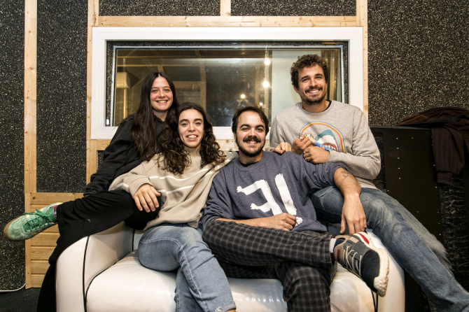 Els quatre finalistes del Sona9 2024 a Estudi Camaleó amb el productor Aleix Iglesias. Foto: Carles Rodríguez