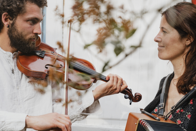 Magari són Ivan Garriga (violí) i Liv Hallum (acordió). Després de més d'una dècada rodant per mercats i fires, balls de plaça i festes majors, i d'aprendre de referents com Artur Blasco, presenten el primer disc, Diumenge (Segell Microscopi, 2024). A Sons de la Mediterrània estrenem el clip d'"Arrels".